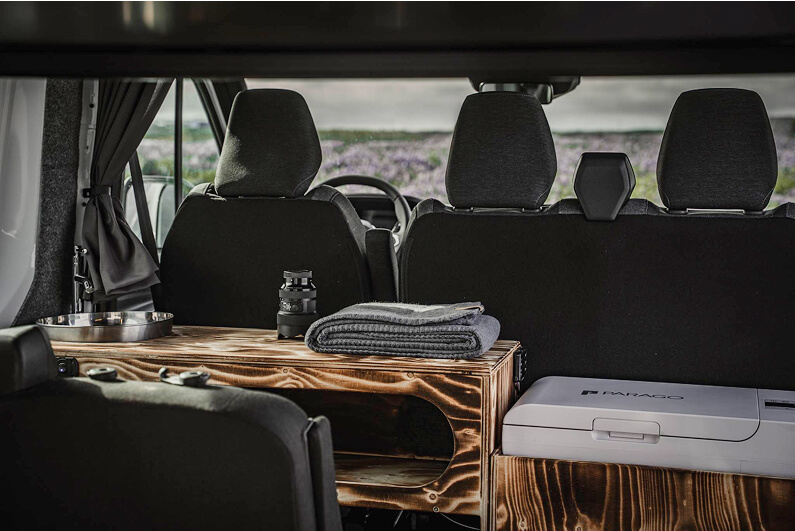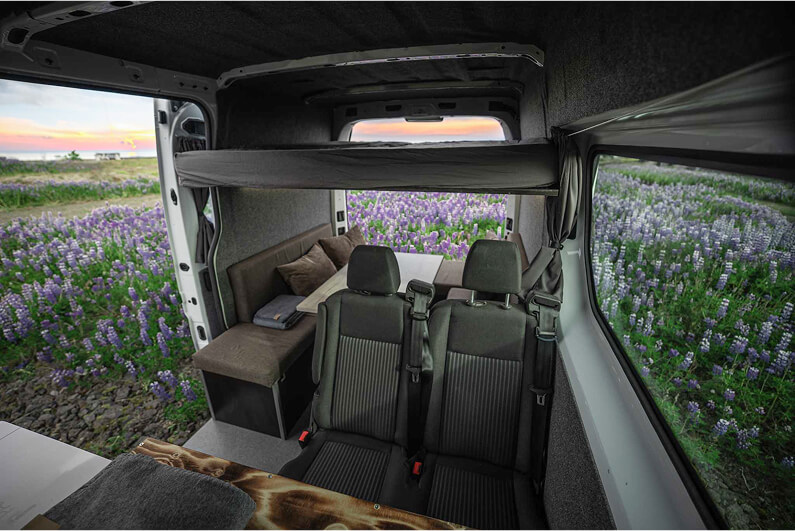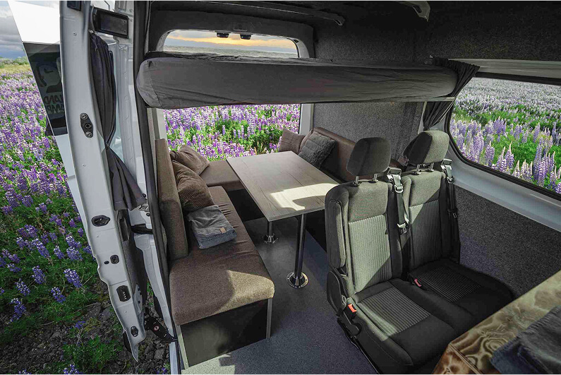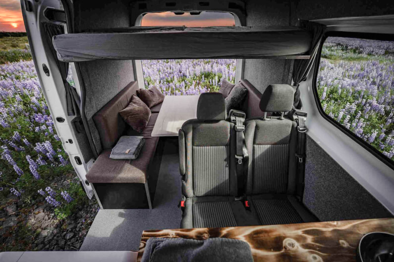 Renault Trafic 2022 campervan is ideal if you’re traveling with 2 friends or family members! You can all sit together in the front while exploring the Icelandic scenery, enjoy a meal or a game of cards in its spacious living room, and when the sun goes down, fold the table and ‘hit the hay’ in its 160x200 bed. It’s the perfect choice to travel in comfort and save on accommodation!